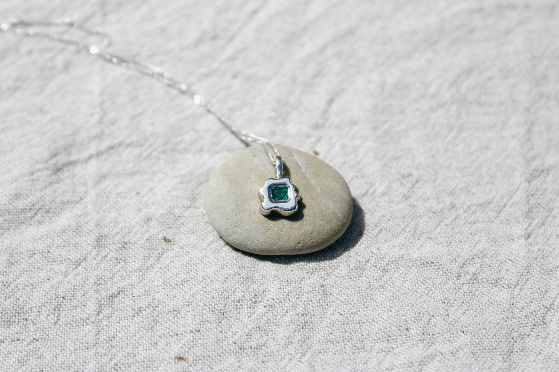 A wavy silver necklace, with a bright green emerald. Comes with a 925 sterling silver chain, length is 45cm.