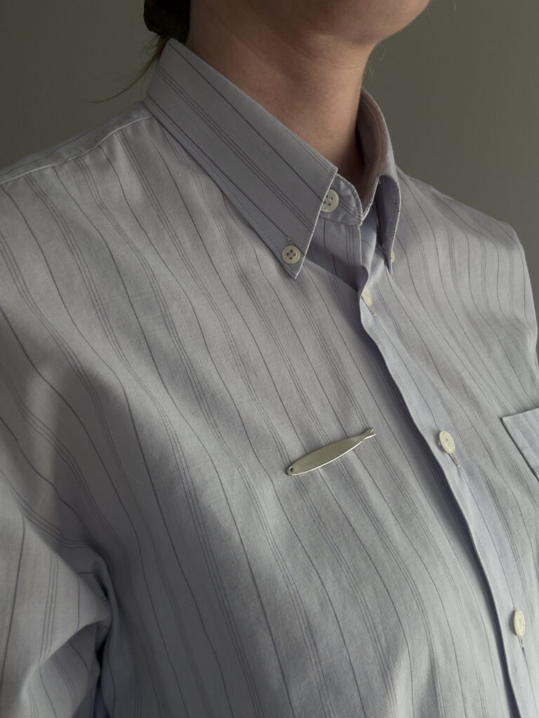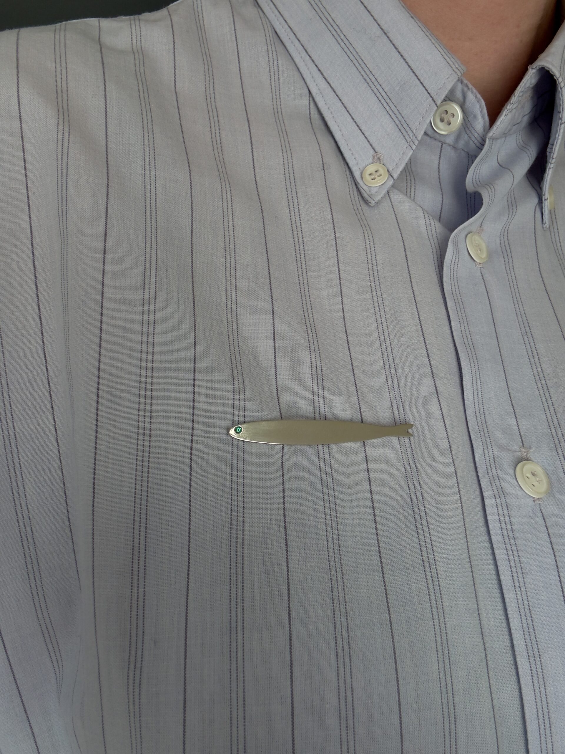 Recycled 925 sterling silver fish pin with a 2mm emerald. The length is 54mm. It has two small pins on the back so it stays put.