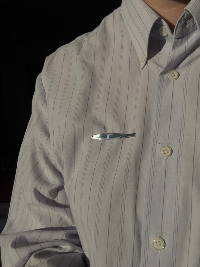 Recycled 925 sterling silver fish pin with a 2mm emerald. The length is 54mm. It has two small pins on the back so it stays put.